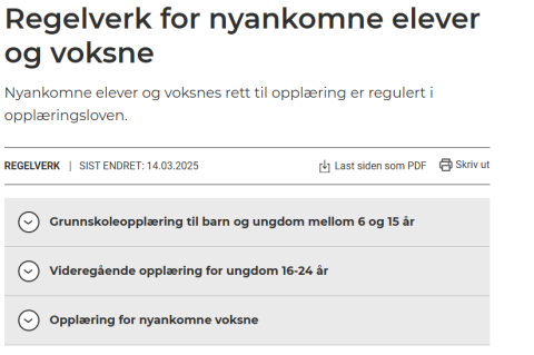 Regelverk for nyankomne elever Nettside Bilde Regelverk for nyankomne elever og voksne. Organisert under Opplæring Regelverk for nyankomne elever