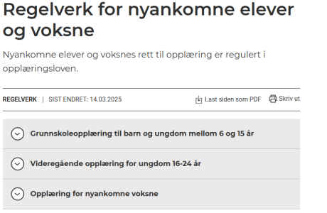 Rett til ulike former for opplæring avhenger til dels av alder og oppholdsstatus. Barn og unge som kommer til Norge som asylsøkere har i utgangspunktet de samme rettighetene til opplæring som andre barn, fram til de fyller 16 år. Rett til barnehageplass og videregående opplæring er mer begrenset. Regjeringenes lovavdeling mener at også barn som oppholder seg ulovlig i landet og som er i opplæringspliktig alder har rett til grunnskoleopplæring når det er sannsynlig at de skal være i Norge i mer enn tre måneder. I ressursene på denne siden finner du informasjon om spesifikke rettigheter relatert til alder og oppholdsstatus.